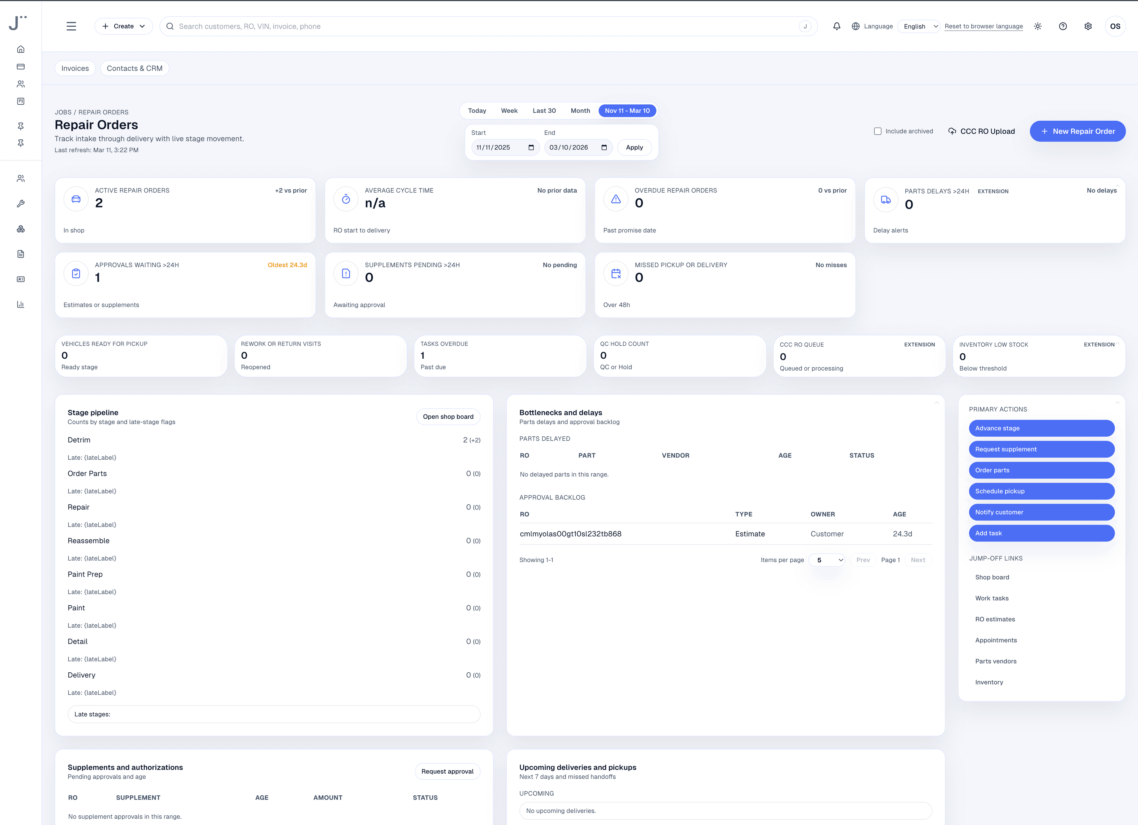 Move estimates, repair workflow, customer follow-up, and payment into one connected system built for the front office and shop team.